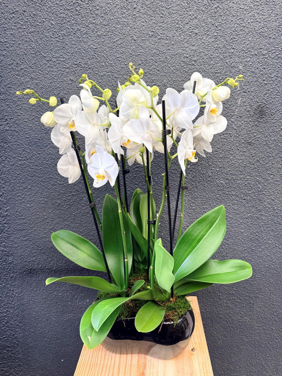 6 stem orchid in black ceramic pot